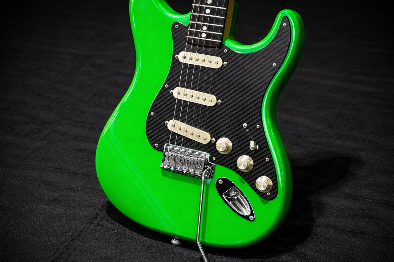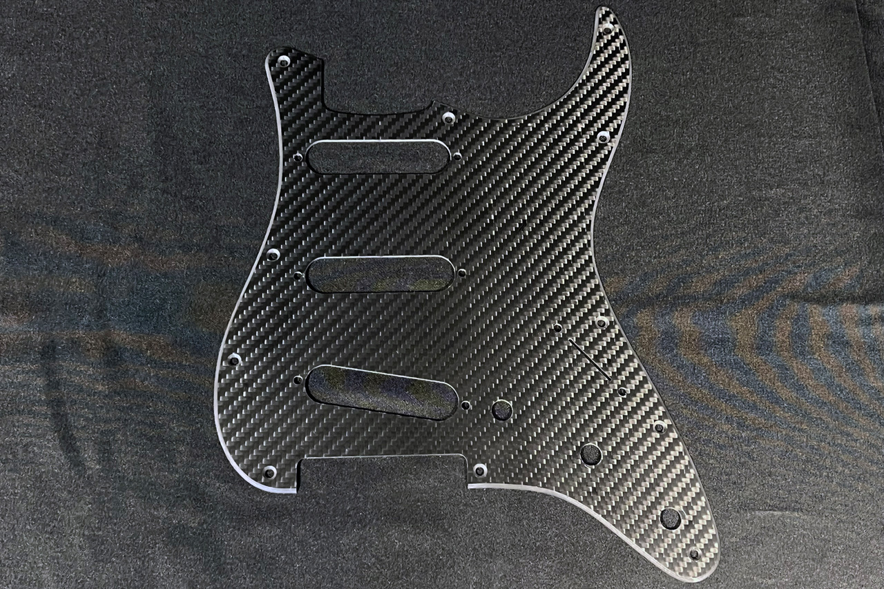 3K綾織のドライカーボンプレートがボディをガードするだけでなく、ドラスティックにイメージチェンジします。2mm厚のCFRP板からのNCカッティング。エッジには綺麗な積層が表現されています。ストラトキャスターとテレキャスターモデルから。
